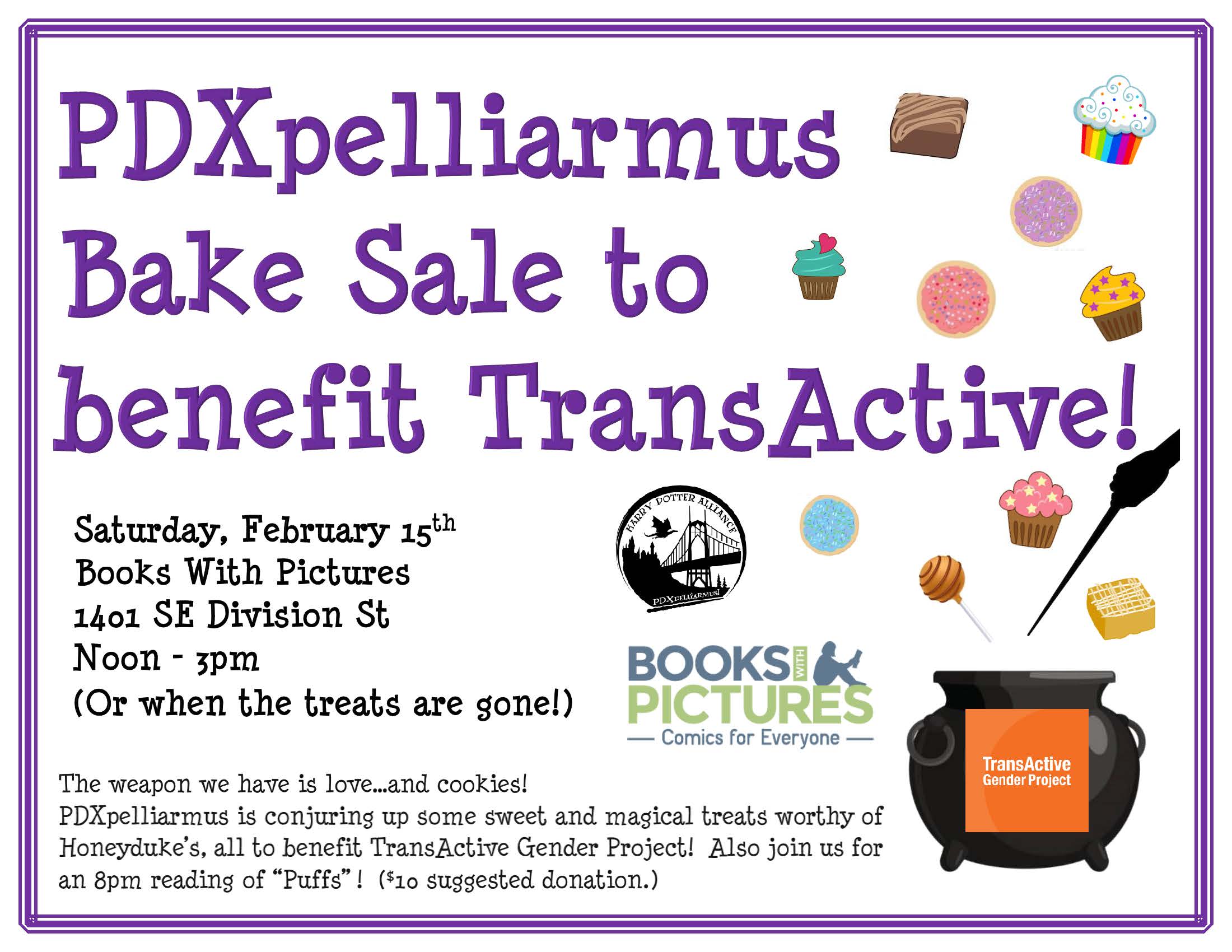 The weapon we have is love…and cookies! In February, PDXpelliarmus baked up some sweet and magical treats worthy of the Hogwarts Express trolley. Chocolate Frogs! Butterbeer cookies! Cauldron cakes! These goodies and many more were on sale at Books With Pictures on Saturday, February 15th and at The Nerd Out on Sunday, February 16th, with all proceeds going to benefit TransActive Gender Project.