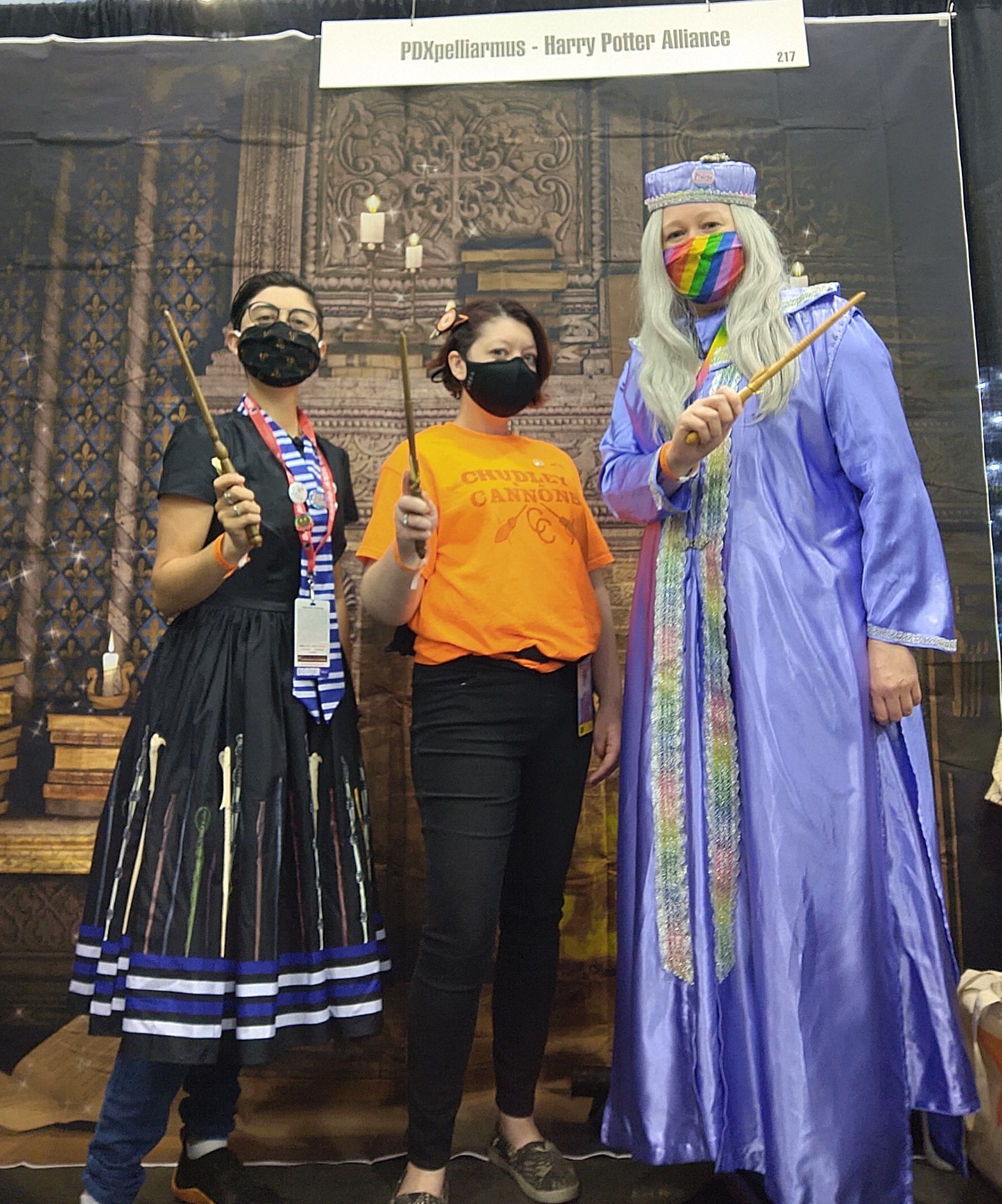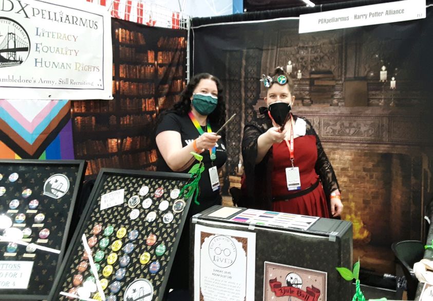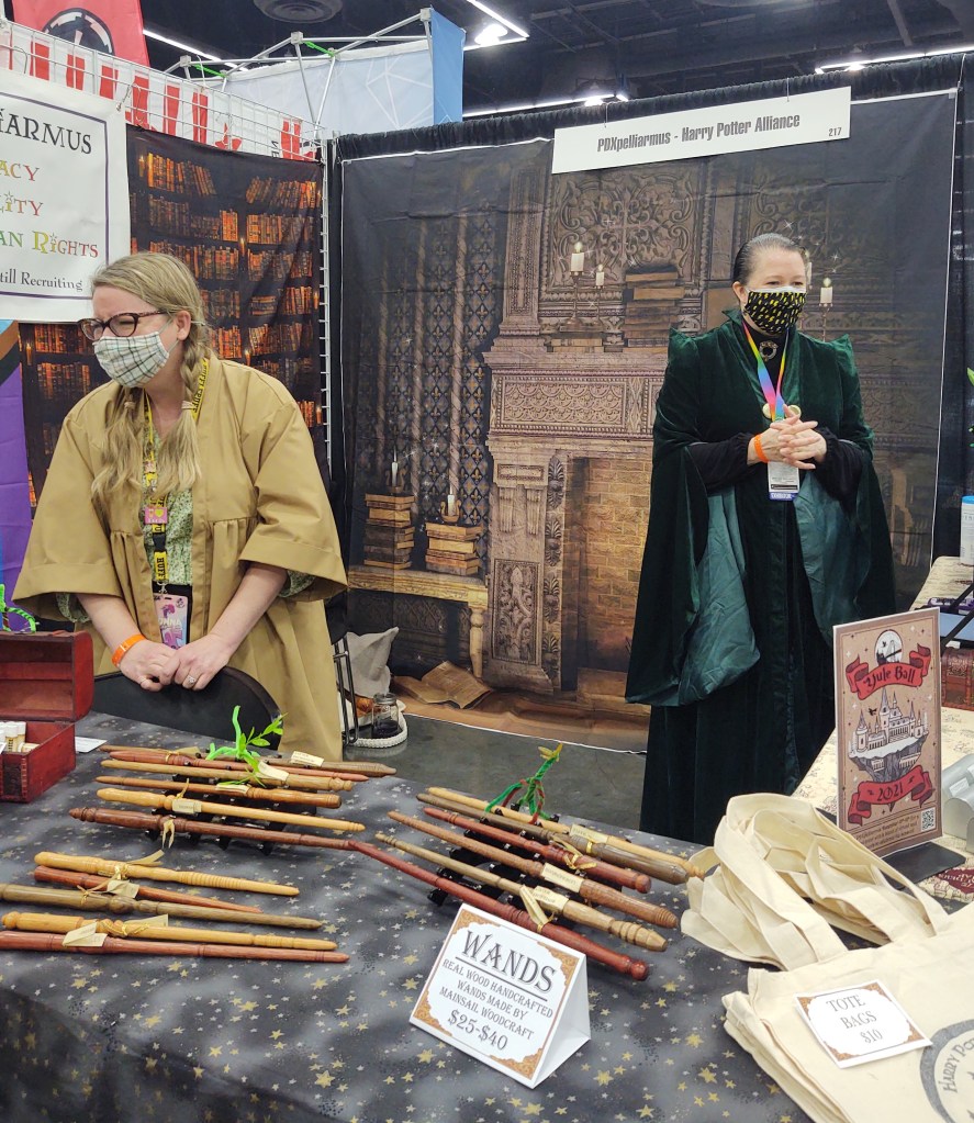 PDXpelliarmus brought some magic to the 2021 Rose City Comic Con! We hosted a booth in the exhibit hall featuring our wizard activist accessories like pronoun House Pride buttons, magnets, tote bags, and Portable Patronuses! This year we also featured real wood wands made for us by Mainsail Woodworks.