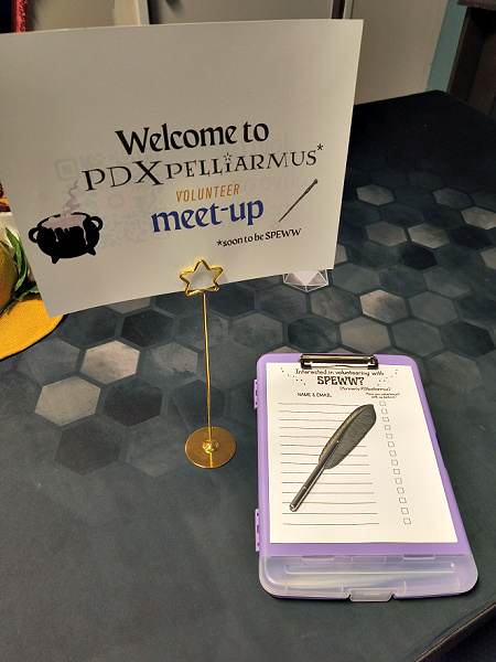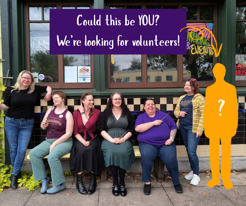 What sort of time commitment is volunteering? Honestly, we’re happy with whatever time you can give us. Though we like o have people in blocks of 3-4 hours, if you can’t spare that much, that’s cool. We always need someone to fill in somewhere, whether it’s selling merch at our booth at Rose City Comic Con or taking over the table in the Great Hall so someone can go grab food during Wizarding Weekend.